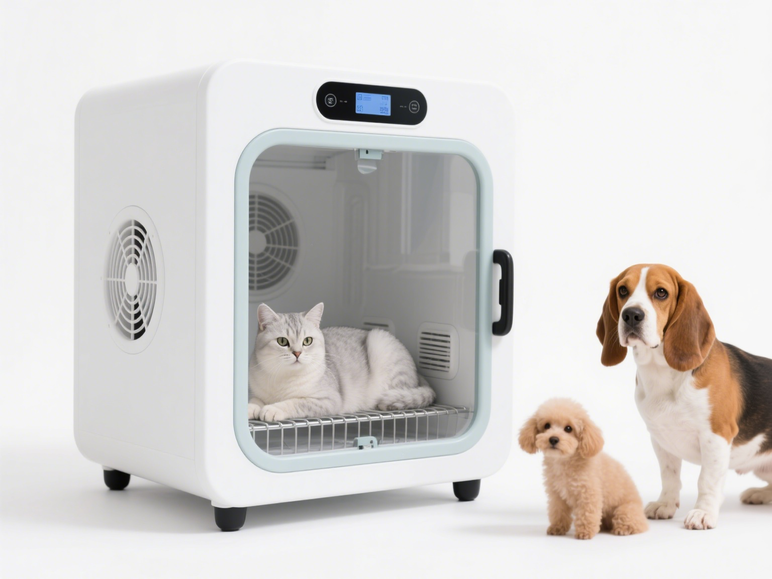 Safe pet dryer: Gentle warm airflow (adjustable temp), low noise, enclosed design—reduces stress post-bath/outdoor use.