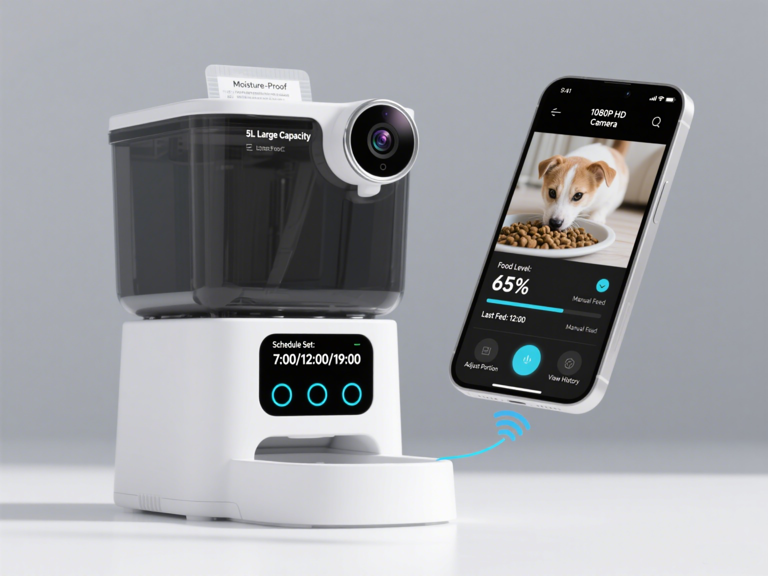 Programmable feeder: Schedules/remote app control, portion management, anti-jam design, battery backup for power outages.