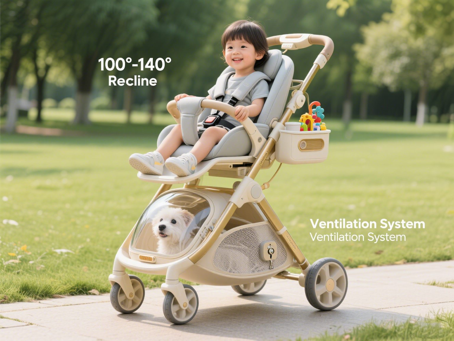 Portable collapsible stroller: Weather-resistant canopy, padded interior, storage pockets, smooth wheels—for walks/vet trips.