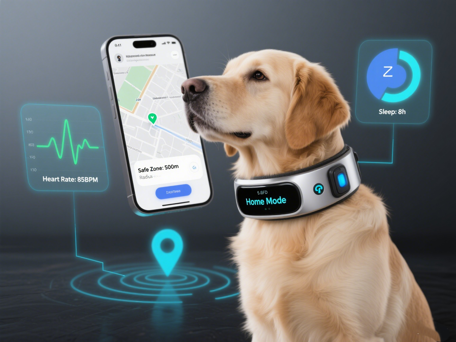 Pet wearable: Real-time GPS tracking, health monitoring (heart rate/activity), geofencing/voice commands, lightweight & water-resistant.